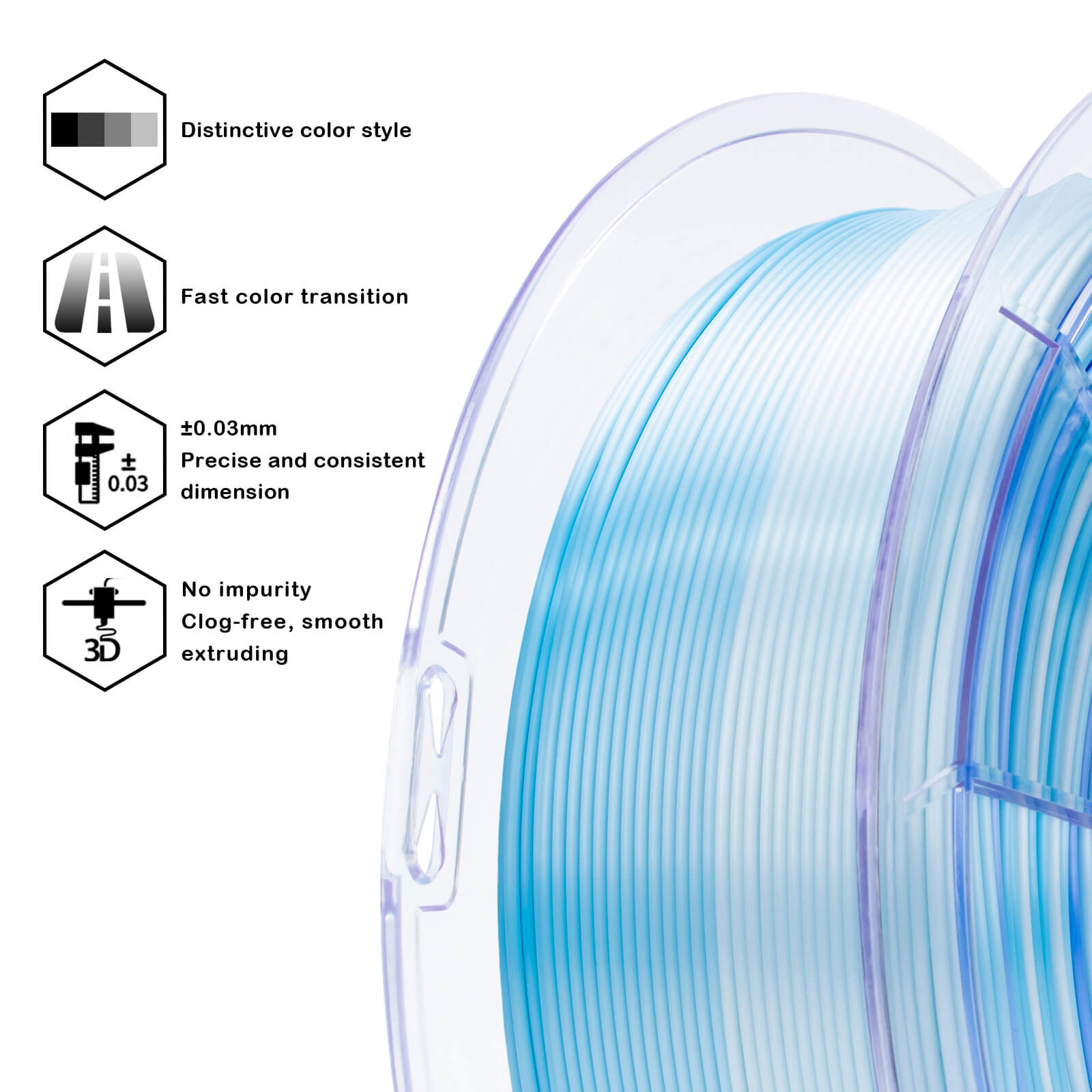 - [Fast Color Change Silky PLA]- The 3D Craft "Ice Blue" combined multiple colors in one shine pla filament. Higher-cost production technology to achieve the true faster color changing aim. The silky surface offers a shine, gloss look, giving your 3D works a unique and stunning style.
