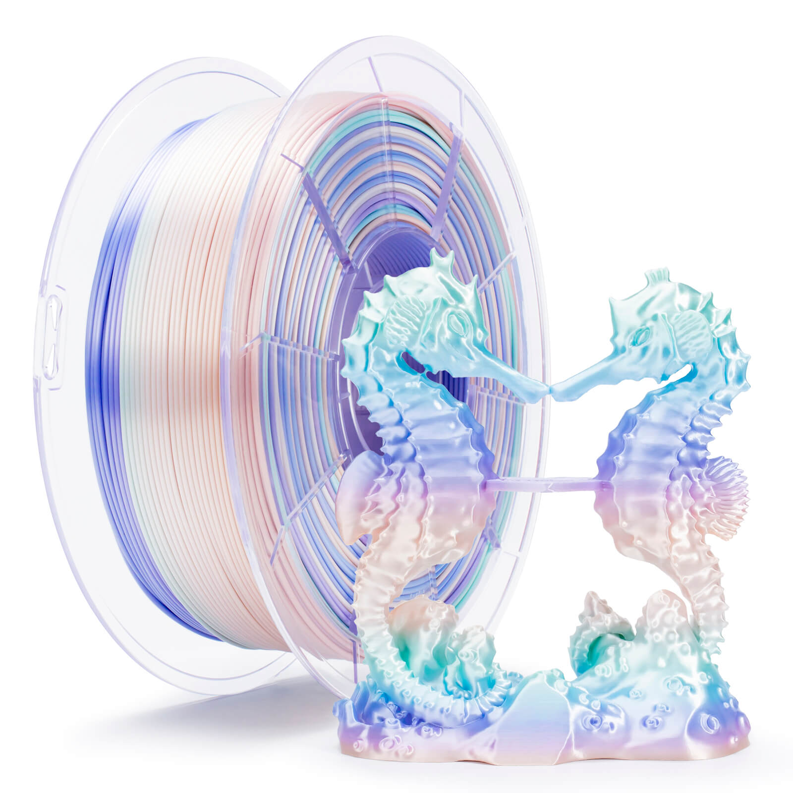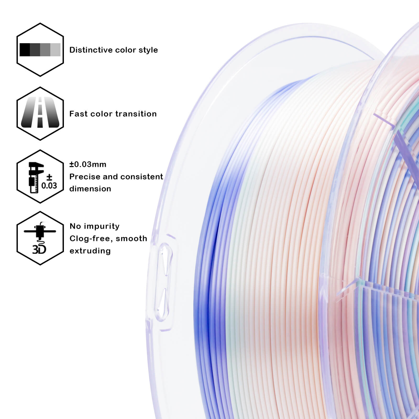 - [Fast Color Change Silk PLA]- The 3D Craft "Pastel Pearl" combined vibrant colors in one shiny PLA base. Higher-cost production technology to achieve the faster color changing aim. The silky surface offers a shiny, glossy look, giving your 3D works a luxury style.(Color changing speed please reference our model weight mark in picture)