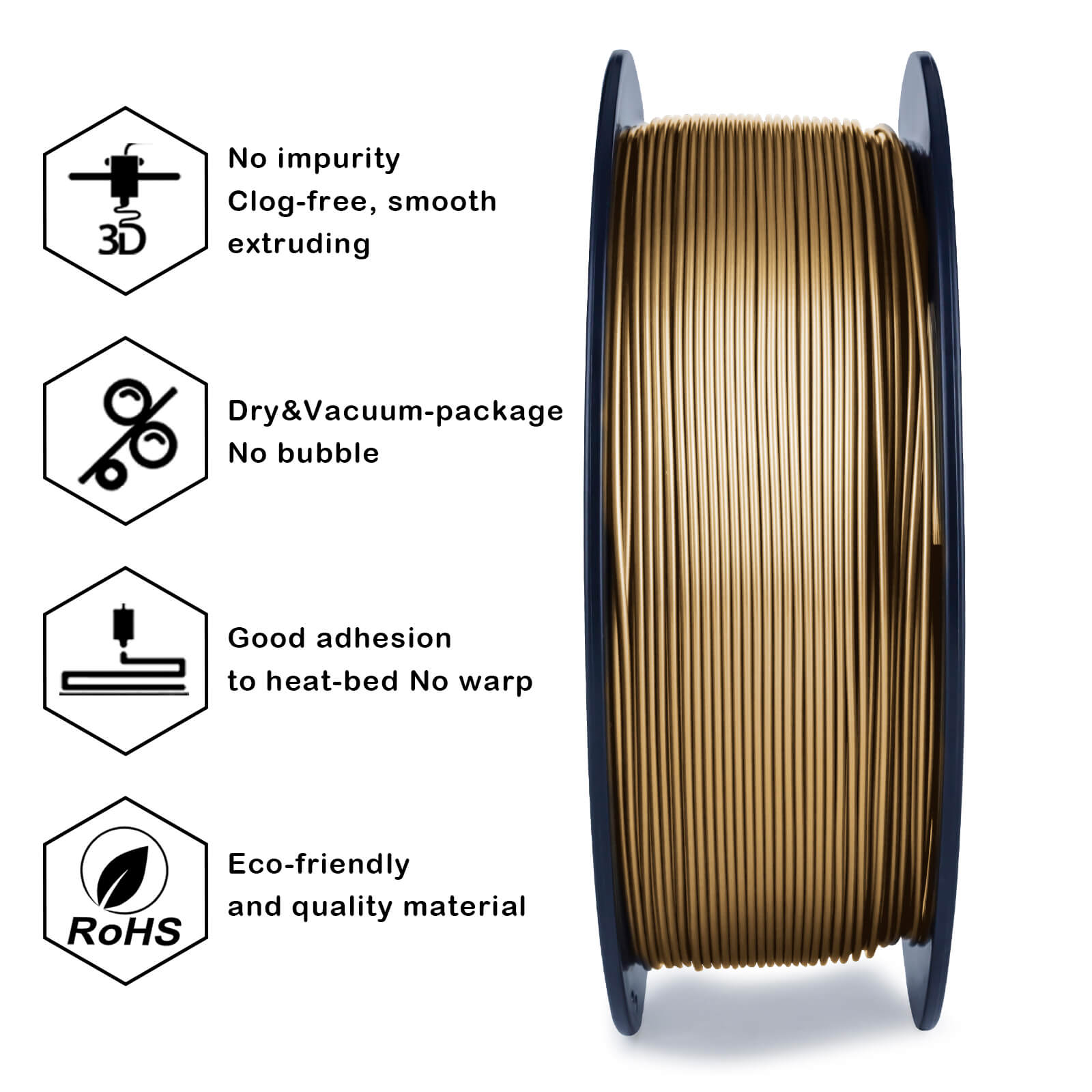- No bubble, Tangle-free, Clog-free. Metal infilled filament makes a metal appearance